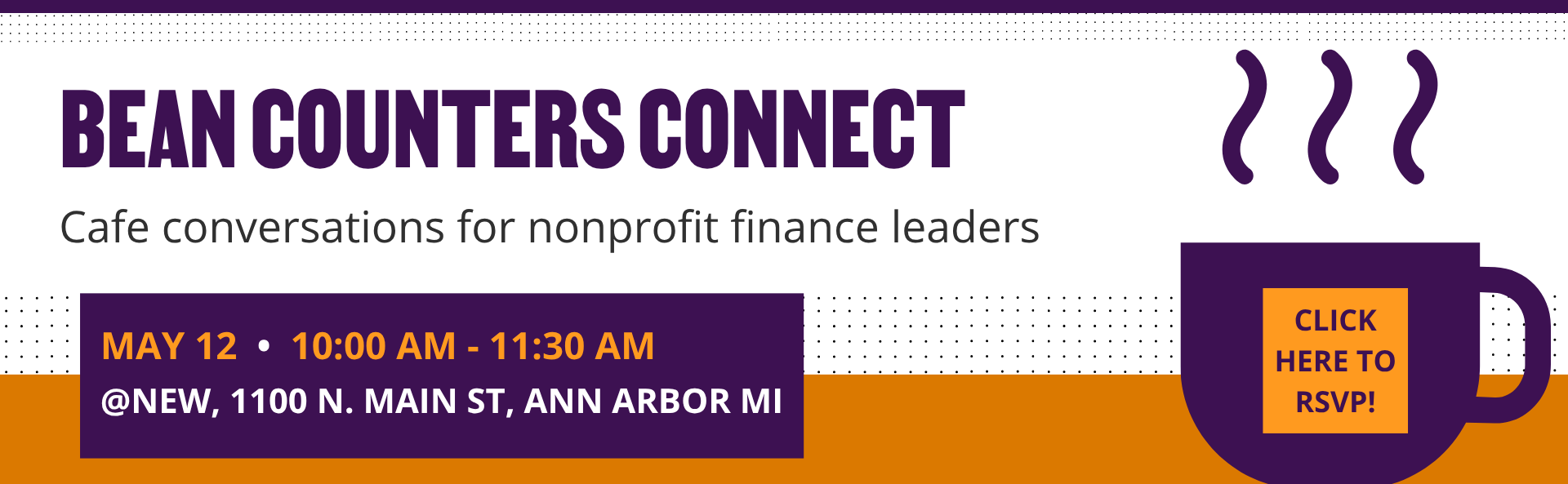 Bean Counters Connect is a free, monthly gathering open to anyone working in non-profit finance. We meet monthly on the 2nd Tuesday at NEW Center and other locations in Washtenaw and Wayne county. We’ll chat, share wins and challenges, and start building a network of support across organizations. Come as you are…your brilliance is welcome here!